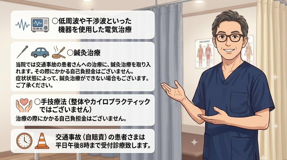 ○鍼灸治療 当院では交通事故の患者さんへの治療に、鍼灸治療を取り入れております。その際にかかる自己負担金はございません。