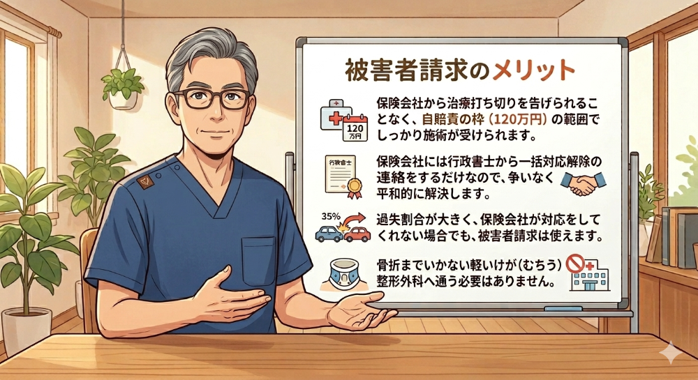 1 保険会社から治療打ち切りを告げられることなく、自賠責の枠(120万円)の範囲でしっかり施術が受けられます。